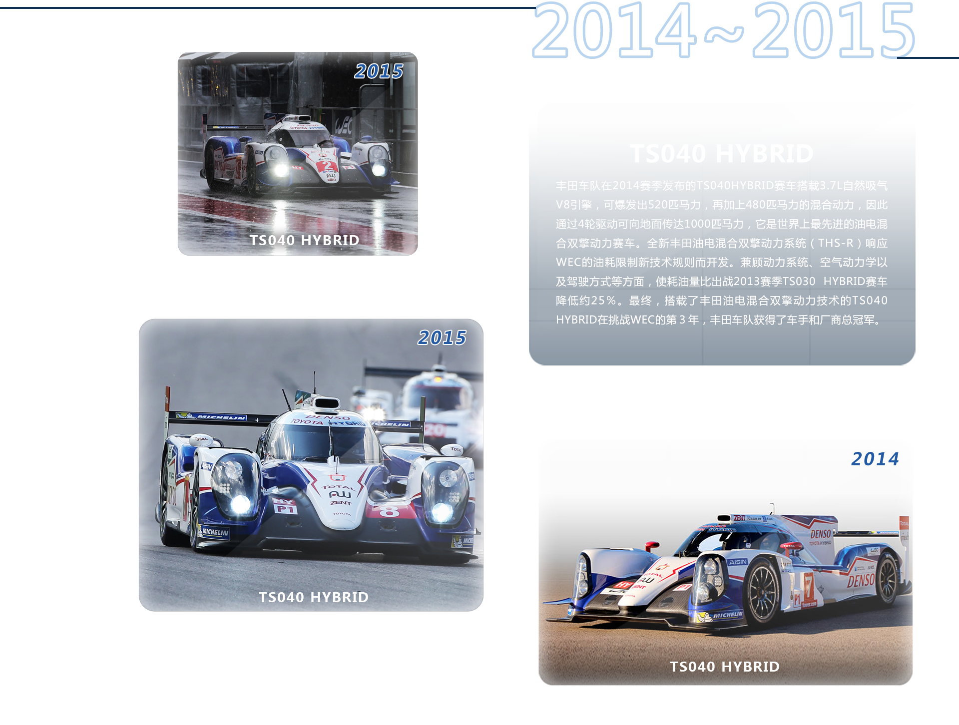 在WEC中,除了速度,能效也是左右成败的重要原因。在2014赛季中,丰田凭借丰田油电混合双擎动力赛车TS040 HYBRID摘得厂商总冠军、车手总冠军。作为世界冠军参加2015赛季的丰田车队将为卫冕两个冠军头衔,并为夺得勒芒站冠军而出征。