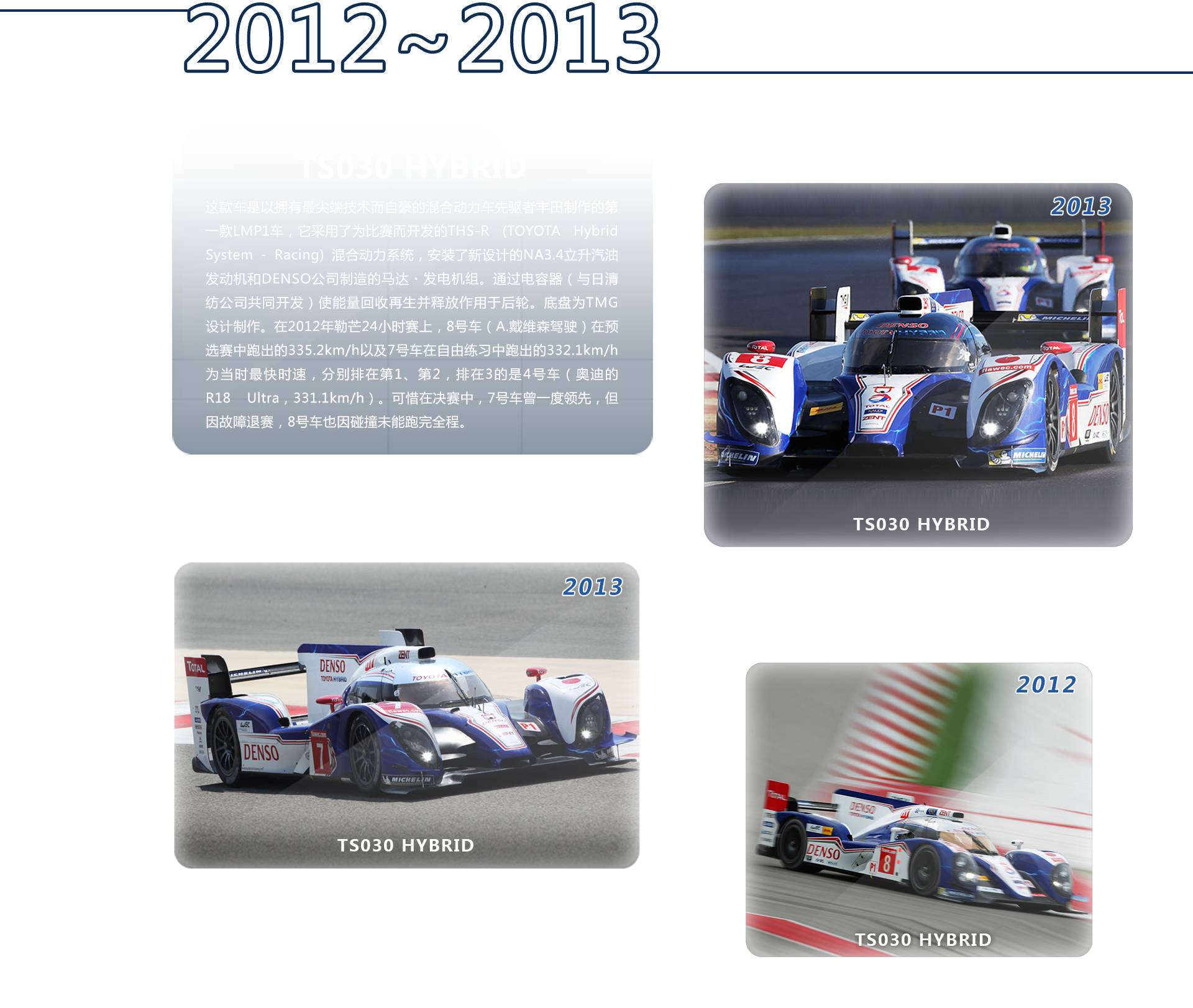 2012年10月,FIA世界耐力锦标赛(WEC)再次回到日本富士高速赛道举行。比赛中,亚历克斯 • 维尔兹、尼古拉斯 • 拉皮埃尔和中嶋一贵三位选手驾驶TS030 HYBRID赛车从预选赛开始就显示出速度强势,压制住了最强对手的2台R18 e-tron quattro奥迪赛车而夺冠。这是20年后为WEC日本站锦上添花的日本赛车的胜利。