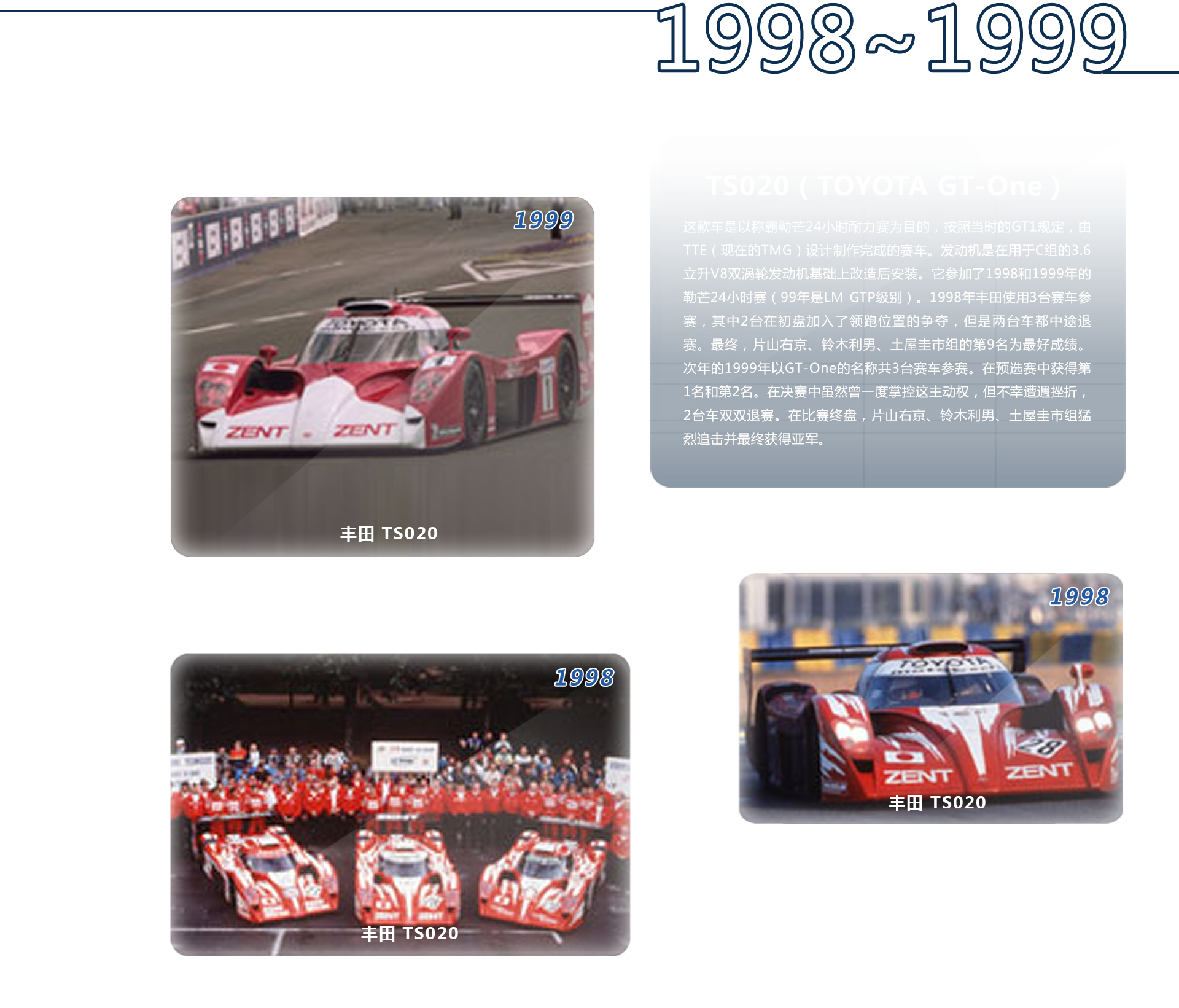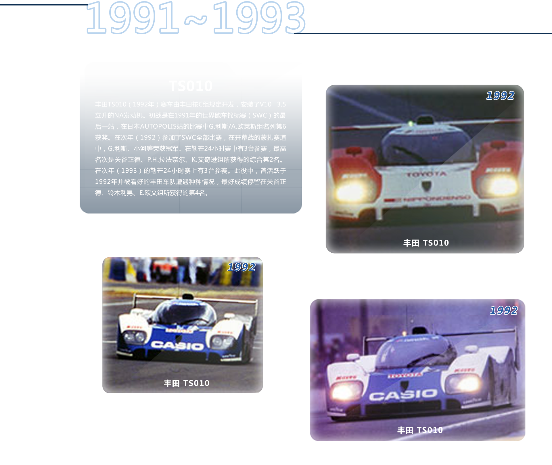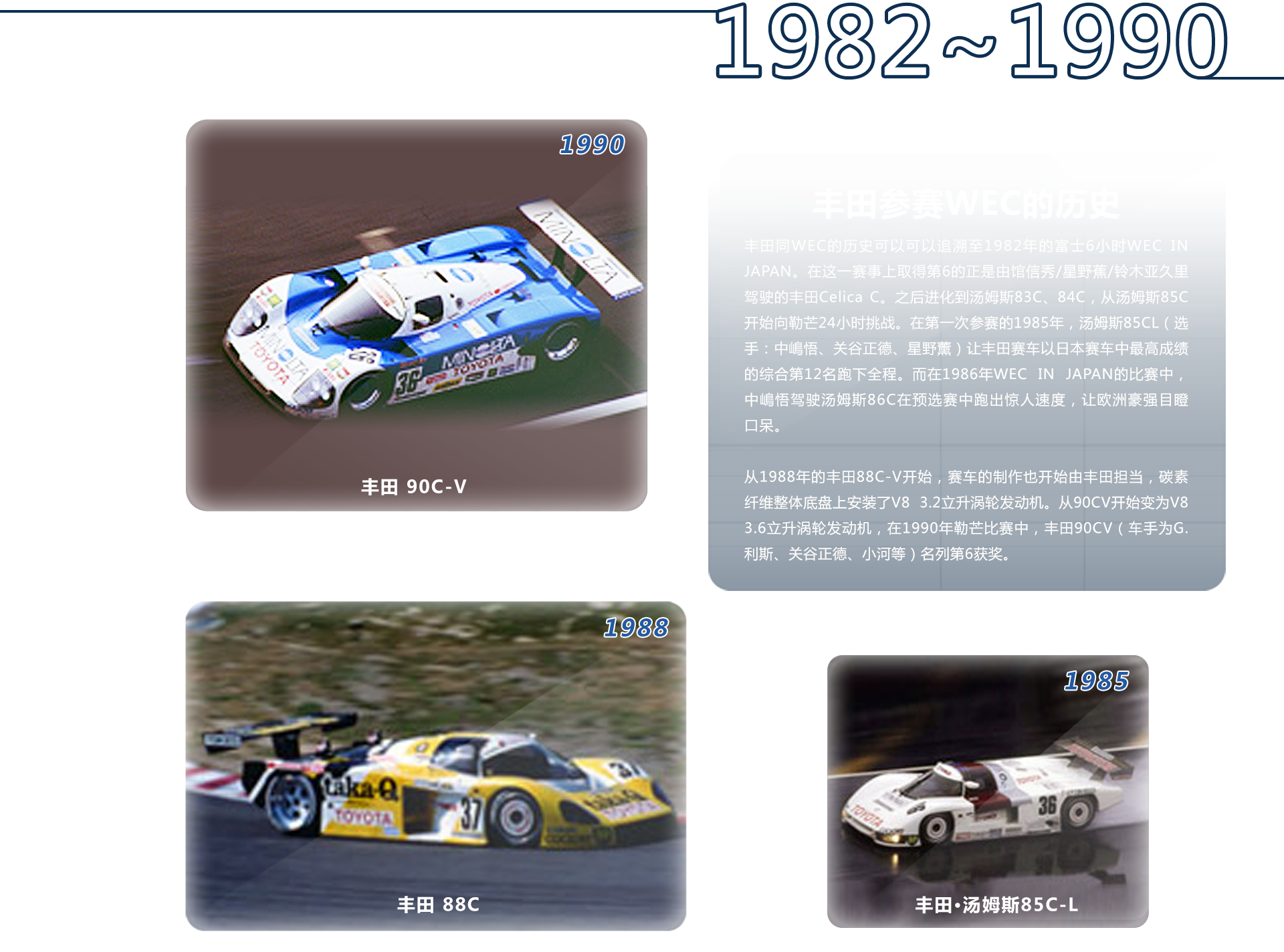 世界耐力锦标赛日本站的比赛从1982年在日本初次举办以来,虽然名称和比赛形式总是变化,但一直举办至1992年才取消该赛事。1986年,驾驶丰田 • TOM’S86C赛车的中嶋悟在预选赛中以令欧洲豪强们惊异的速度杀出。1987年,驾驶丰田87C的G.利斯曾一时领跑。至此好戏不断的日本战车却始终没能收获1枚 金牌,然而去年TS030 HYBRID却获得冠军,不仅丰田车迷欣喜若狂,也让耐力赛粉丝们长久以来郁闷的心情得以畅快。